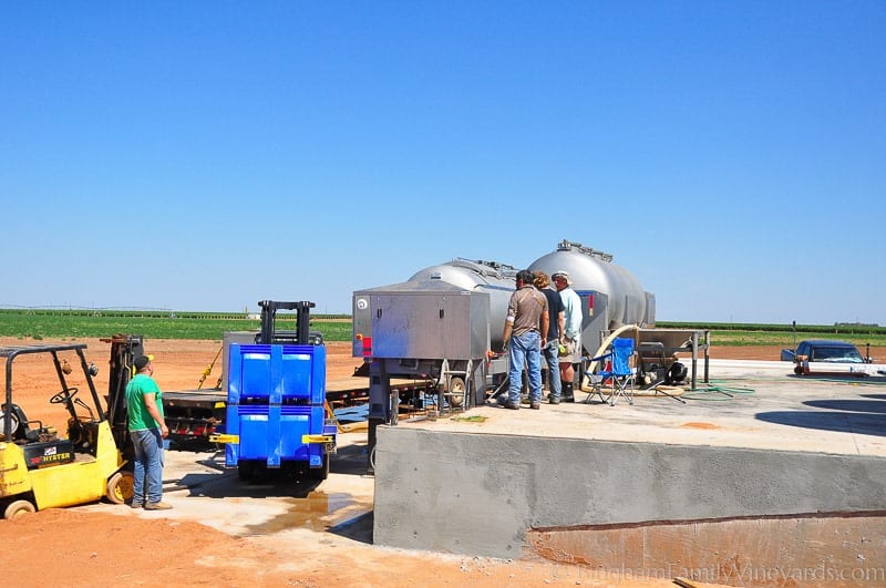 I also got to meet Chase Lane who with his wife has a small vineyard of Tempranillo in Ropesville with another acre or so close to Brownfield. He had proudly brought in this beautiful bin of fruit to be loaded on a truck with some of our grapes to go to Messina Hof Winery.
