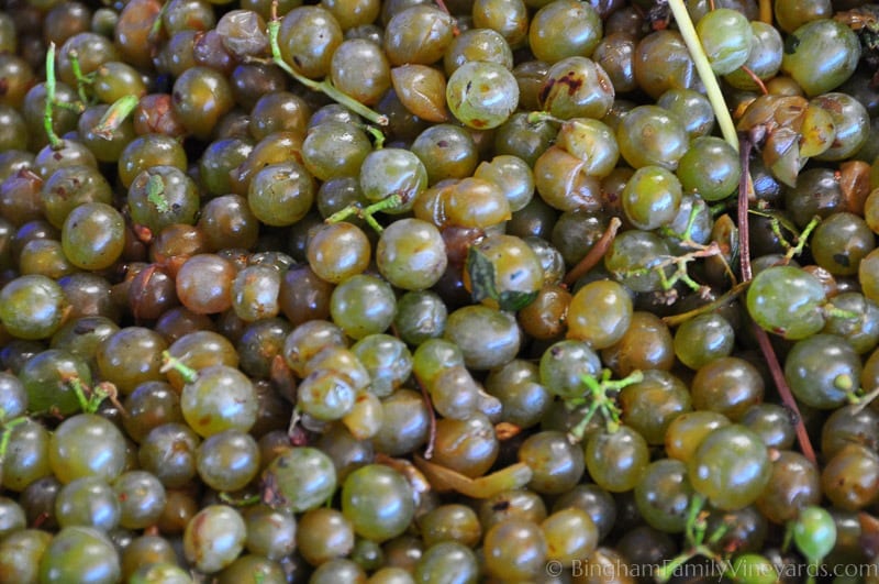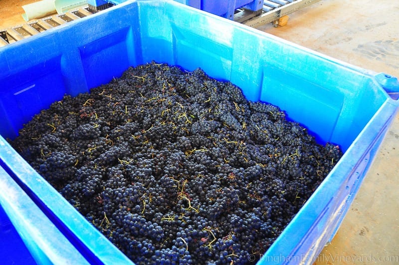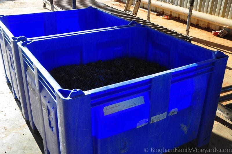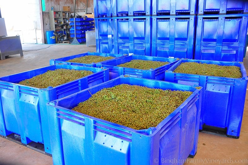 Since the majority of the Viognier grapes are from secondary buds (because of the late spring freeze that we had freezing out the primary buds), these are being harvested a little later in the season than in some years.