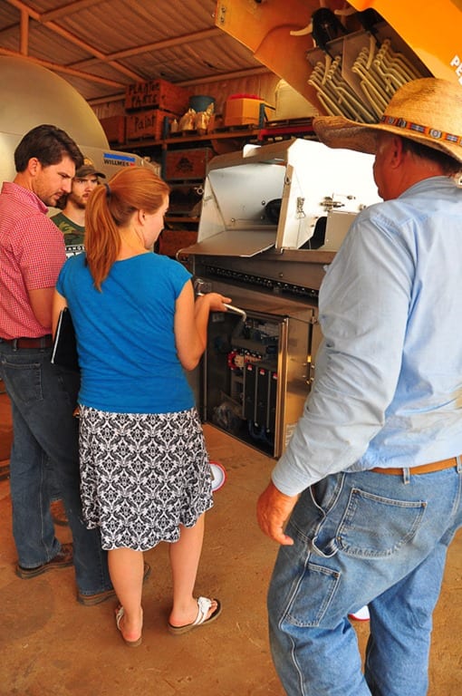 14.08.04_VineyardEquipment_023-web To be honest I don’t really know how this piece of machinery is supposed to work, but it is supposed to sort, de-stem, remove mog (which is “matter other than grapes”) that you don’t want in your juice as it is fermented into wine. You can even set it so that you have only juice and berries left. You might even want to remove all the “little” berries. Different winery might want different processing, so you can set it accordingly. 14.08.04_VineyardEquipment_025-web Maybe we should give them a little more time to measure and put all the pieces together, and then we will come back to see how it all works.