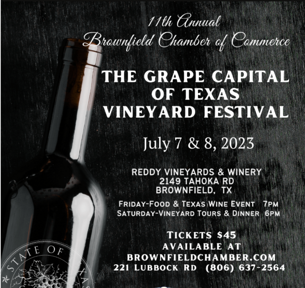 The 11th Annual Grape Capital of Texas Vineyard Festival is being held Friday and Saturday, July 7 & 8, 2023, in Brownfield, Texas.