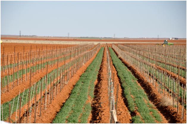First we make vertical marks with a GPS tractor to mark where the individual grape plants should be located within each row. Those lines mark show where the plant should be placed. Each plant should be 4 feet from the next plant in each row.