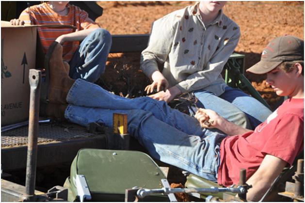 You have someone driving the tractor and three riding on the plow. The plants are in bundles of 25. The first person (in this case kiddo) cuts the bundles apart and separates the bundles into smaller bundles. The next kiddo (the girl in the baseball cap) separates the smaller piles of plants to hand them one at a time to the third kiddo. All three of these are my kiddos, but we do have some employees that we actually pay to do work.