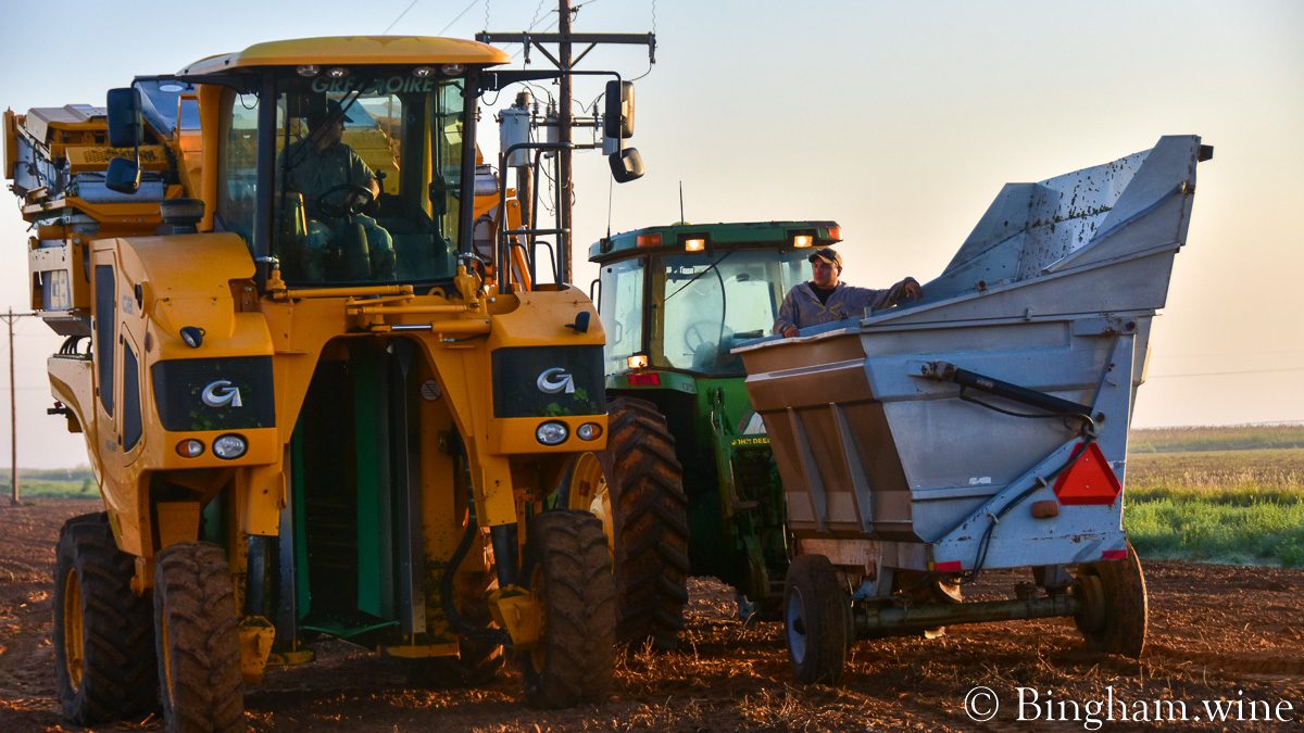 These dump carts will then dump the grapes into bins which will be weighed and then loaded on a truck to be taken to Doug and the workers at Lewis Wines for pressing. The object here of course is to get the grapes into those white containers rather than between the bins or outside of those bins.
