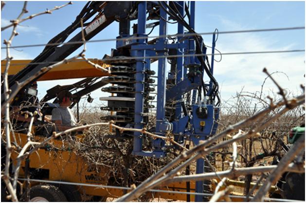 The pre-pruner comes along and cuts off the long scraggly pieces that would just be a burden and not productive areas to grow grapes.