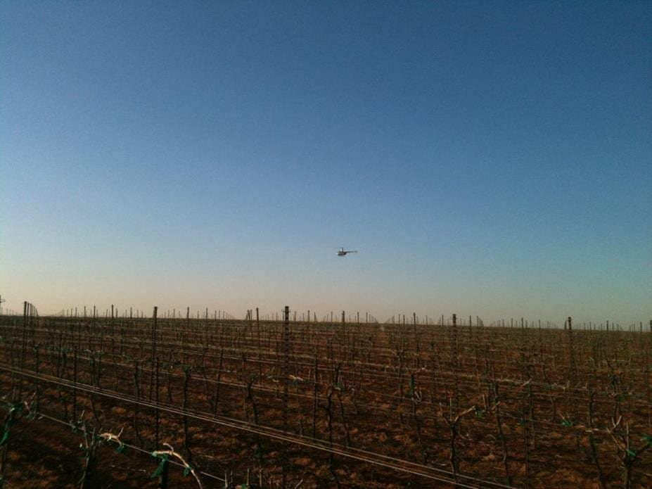 Another interesting idea that Nick and another grower tried last Friday on the 19th during that freezing weather was to hire a helicopter to fly over the vineyard. The idea is the inversion theory, displacing the colder air below with the warmer air above. This doesn’t work if there is much wind.