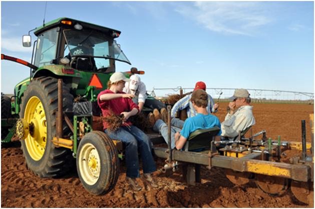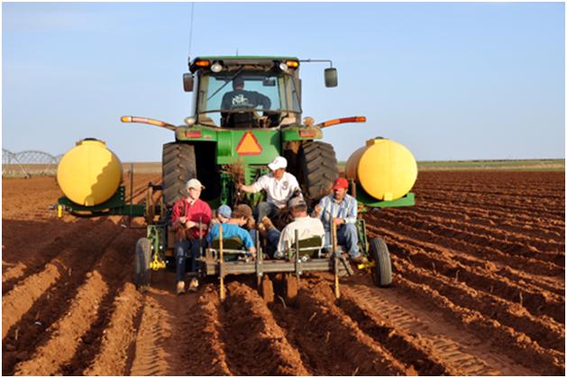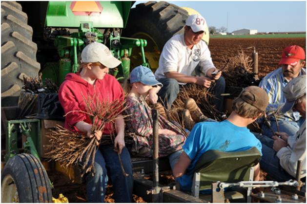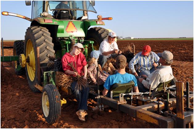 They learned that it was helpful to have a sixth person riding on the back of the plow and coaching the two planters. My cellist is doing that job on the plow above. Comments such as “Planter 1, you’re a little late,” “Planter 2, you’re a little early”, “Your rhythm is off,” or “Your rhythm is good, but you’re a little late.” Someone has to go behind the planters and check each plant to see if it is sticking out of the ground the way it should. Even though they do look like sticks, they really do have to have their roots in the ground if you want them to grow. When they had a “coach” helping, they didn’t seem to have to reposition as many plants.
