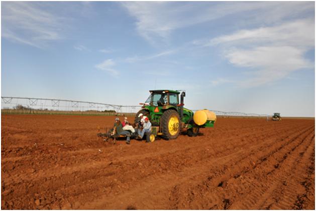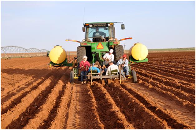 The guys all think that My Honey came up with the idea of adding a second seat. But he says someone else probably came up with the idea. This planting day from last two weeks ago, we used two tractors and two “planters” on each plow. Notice there are five people on the plow. The guy’s job that is closest to the tractor is to cut loose the bundles of plants. He then hands them to the other two guys (or gals) facing us. They are the ones who get a large handful and then hand the plants one at a time to the two planters in the luxury recliners with their feet propped up. The planters relax back in their easy chairs and alternate placing one plant at a time into the ground. All of this efficiency allows the tractor to move along at a faster speed.