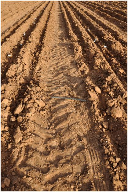 The dirt (piled up from the ditches made to put the drip irrigation system in) shows you we have anywhere from 18 inches to four feet of red top soil over white caliche which makes for good soil to grow grapes in.