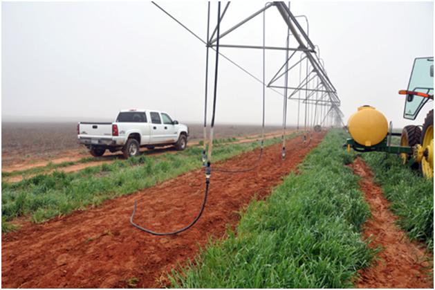 This is a pivot circle system. Usually on the High Plains, underground (or above ground) drip tape is used for watering the vineyards. But when we first put the plants in the ground we like to irrigate the plants with plenty of water. If you are lucky enough to already have a circle system on your land that you have been using for row crops, then you can just use it to irrigate the new plants. Currently this circle pivot actually has LEPA drag hoses attached. You leave them on if you want to row water the plants in. You take them off if you want to spray water on the plants.