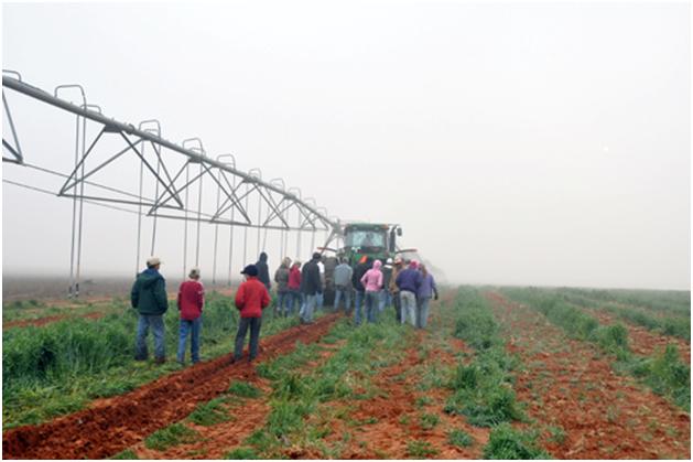 Here is another idea that had to be adapted some. The first five acres were flooded as an initial watering. That is Bobby Cox’s favorite way to do it. This was taking way too long so the last fifteen acres were just spray watered with the circle pivot system. We usually always do it by flooding the rows, but the soil was so moist to begin with that the guys decided it would make a good experiment plot to see how the last fifteen acres do being spray-watered in.