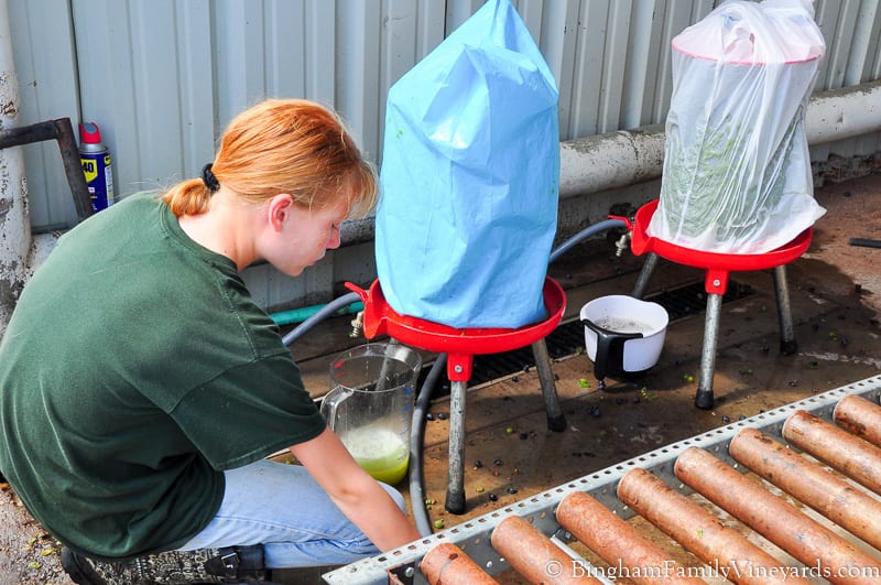 We started with sampling just random berries from each plot or vineyard. Then as we are getting closer to harvest, whole clusters are picked for a more through and accurate testing because then the whole cluster is being represented, not just a few of its grapes. Removing whole clusters rather than berries also protects the rest of the fruit from bruising. More samples will be taken tomorrow to choose the best day for harvesting each varietal grape and each plot of vineyard.