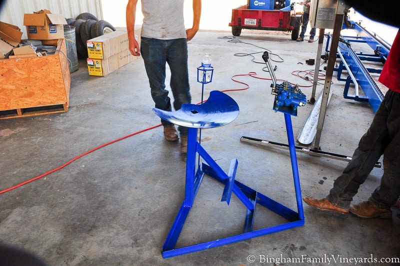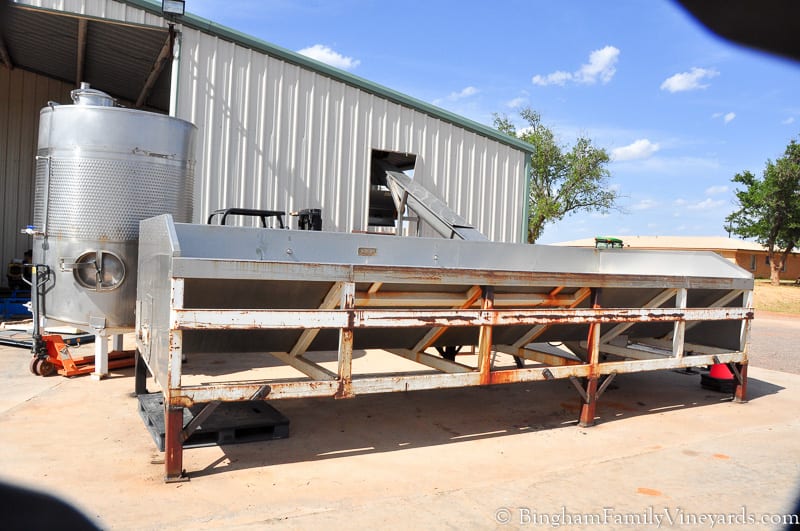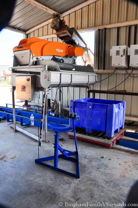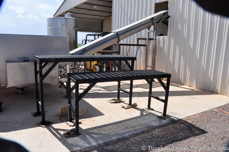 Shortened the legs on the receiving bin to make it a better height to work with our other equipment. Since it it shorter, maybe I will be able to get better photos of grapes at that stage of processing. A new system for conveying the bins through after cleaning is done with our Pellenc system.