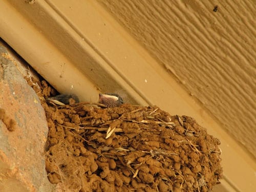 I know you might rather see vineyard pictures, but here is an update on the swallows: babies in the nest at the front porch. Yes, I was cleaning the bird poop from off the patio at the front door. And yes, we were having company for dinner last night. I looked up, and what did I see, but the babies watching me work.
