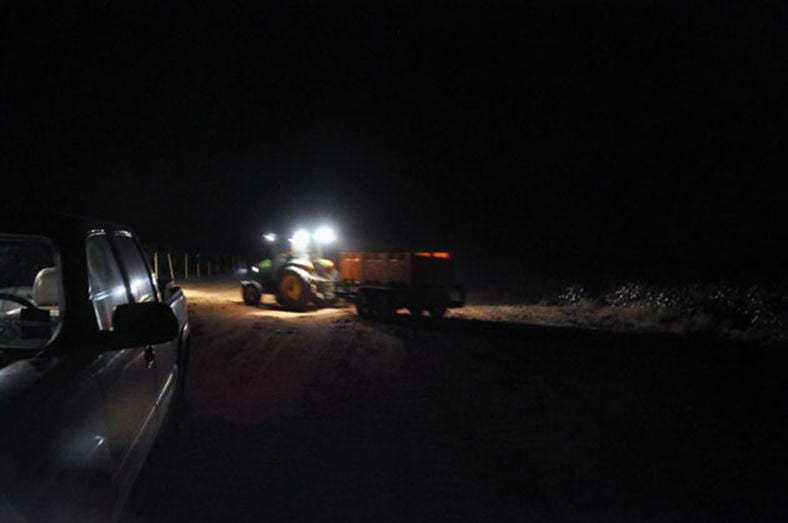 But the darkness does not make for the most interesting pictures since you can’t really see too much. That’s why the harvest pictures that I showed you a couple of weeks ago were taken on a day that was so cool that we harvested in morning. Another reason is that I don’t really like riding on top of and hanging off of a harvester in the dark taking pictures of the darkness.