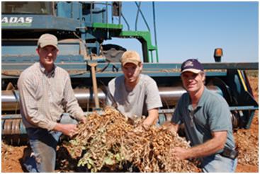 Hey, there is a blog on the Whole Foods web site up today about organic peanutbutter. It also has a picture of a real hunk of a guy. The really good looking one on the right. That one is My Honey. The other two are sons. They are poseing in front of a big pile of peanuts that have been dug up and set to dry in the West Texas sun. The peanuts are about to be thrashed by the combine that is behind them to separate the peanuts in the shells from the vine trash. Then the peanuts still have to be sent to the peanut plant and dried some more, shelled, roasted, salted, ground up, or whatever they need before they are really ready to eat.